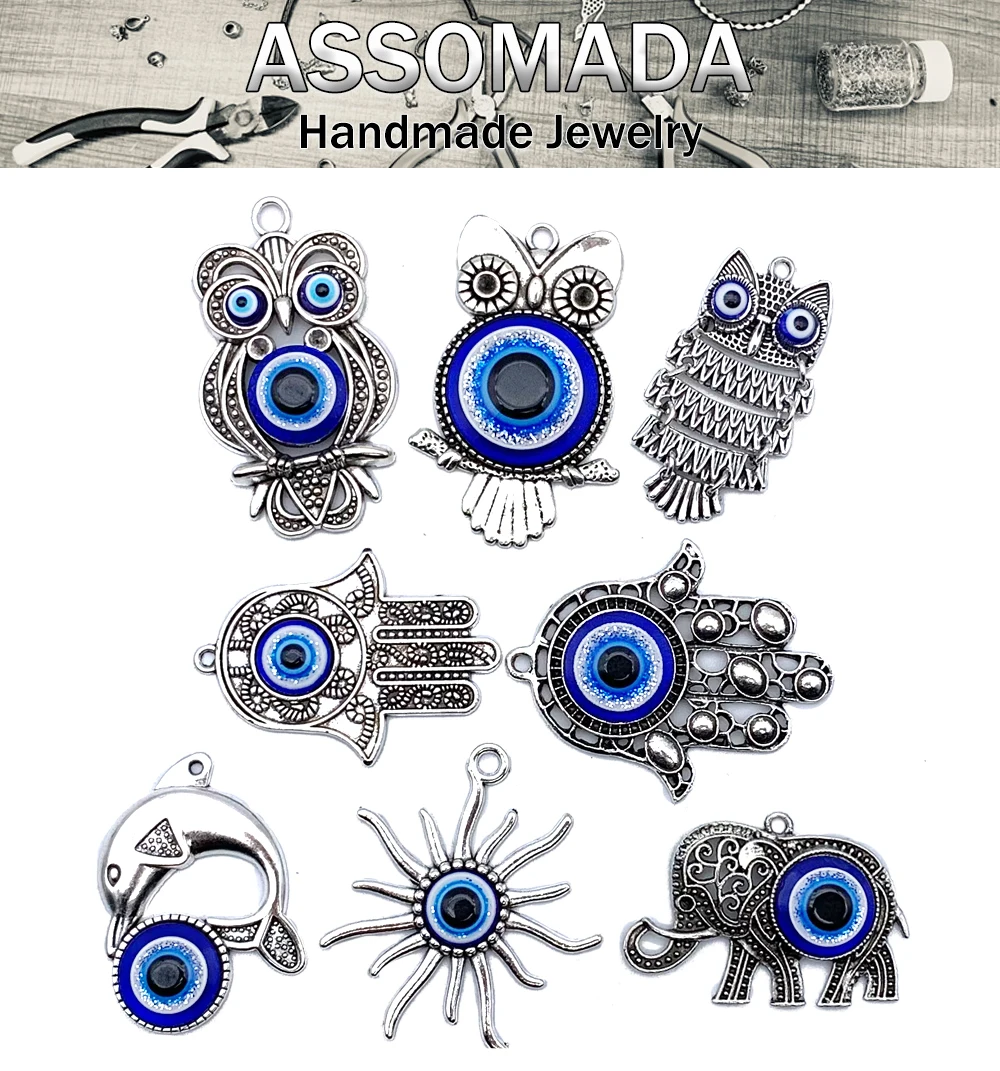 ASSOMADA Metal Evil Eye Charms Pendant For DIY Decoration Keychain Owl Sun Elephant Dolphin Palm Turkish Blue Eye Handmade Jewelry Making Turkish Key Chain Car Bag Decoration Gift